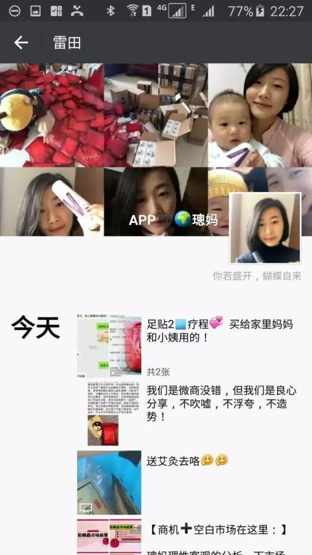 这是我小学老师的女儿,在家带自己一岁多的小孩,坚持做微商,热情而执着。她的朋友圈是这样的: